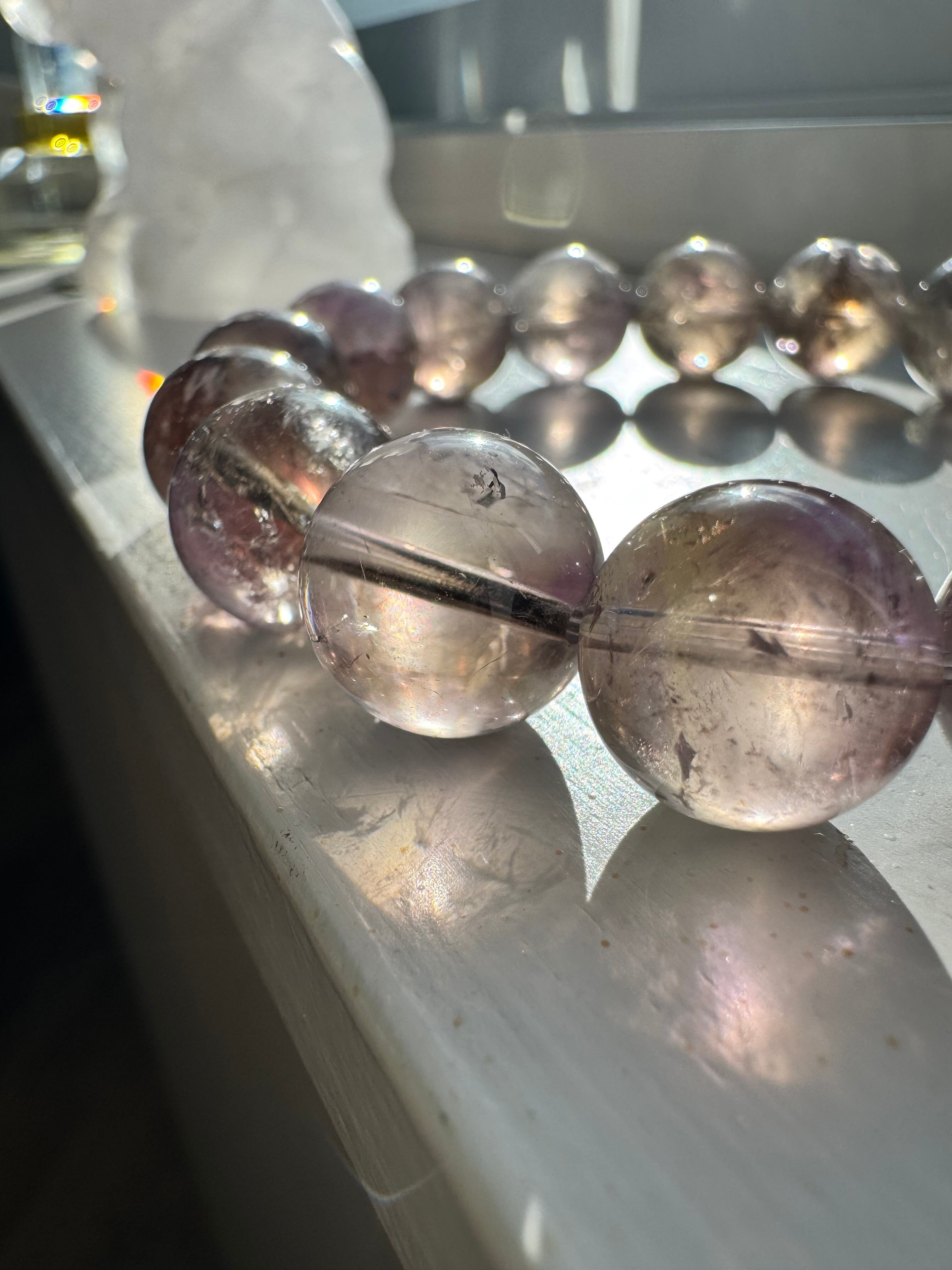 美しいアメシストとグリーンアメシストが融合した「アメグリーンブレスレット」。淡い紫と優しい緑が織りなすモザイクは、まるで自然界の美をそのまま閉じ込めたかのように煌めきます。時折、レインボーの輝きも見られるこのブレスレットは、あなたの手首に華やかさを添え、特別な瞬間を演出することでしょう。